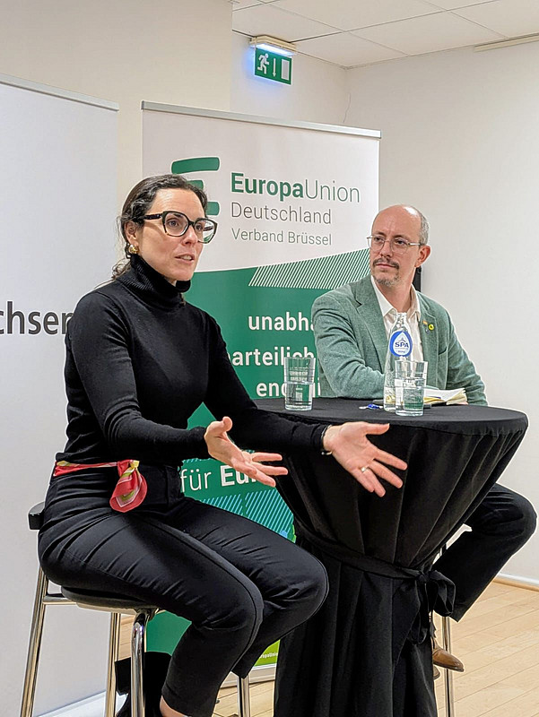 Raquel García Hermida-Van Der Walle antwortete auf die zahlreichen Fragen und Argumente der Anwesenden zum Wahlkampf, den beginnenden Koalitionsverhandlungen, den Aussichten für die europapolitische Ausrichtung der zukünftigen niederländischen Regierung. Erfolgskonzept der D66 sei gewesen, eine Europäische Identität als logisch passend zu einer stolzen aber sehr inklusiven Niederländischen Identität mit wehenden Niederländischen und Europa-Fahnen und diversen Kandidaten zu präsentieren. Jetten sei nicht nur sympathisch gewesen, er hätte auch als Energieminister die Abhängigkeit von russischem Gas überwunden und in nur 2 Monaten LNG-Terminals gebaut, ein Musterbeispiel von Handlungsfähigkeit. Er konnte gemeinsame EU-Verteidigungspolitik den fiskalkonservativen Niederländer/innen als günstiger schmackhaft machen. Die Koalitionsverhandlungen müssten vor allem Antworten auf die Fragen von 1. genügend bezahlbarem Wohnraum (Versprechen 10 neue Städte), 2. dem Ausgleich von Landwirtschaft und Naturschutz und 3. von Migration bringen.