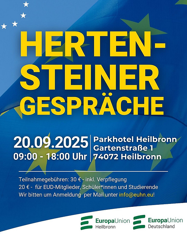 Die 9. Hertensteiner Gespräche stehen ganz im Zeichen europäischer Sicherheit und Verteidigung. Die Veranstaltung findet am Samstag, 20. September 2025, von 9.00 bis 18.00 Uhr im Parkhotel Heilbronn statt. In mehreren Gesprächskreisen und einem föderalistischen Forum haben die Teilnehmerinnen und Teilnehmer die Gelegenheit mit Vertreterinnen und Vertreter aus Politik und Zivilgesellschaft aus dem In- und Ausland über zentrale Herausforderungen und Perspektiven für Europa zu diskutieren