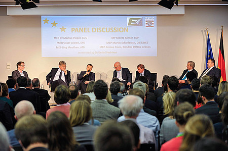 In ihrer Begrüßungsrede hob die Gastgeberin und hessische Ministerin für Europa-Angelegenheiten, Lucia Puttrich, hervor, dass Europa vor einem Scheideweg stehe. Es komme darauf an, die Wahlbeteiligung zu heben und populistischen Strömungen zu widerstehen. Auch nähmen die außenpolitischen Herausforderungen zu. Gerade vor diesem Hintergrund freue sich die hessische Staatsregierung, dass hochkarätige Vertreter aller im Bundestag vertretenen Parteien miteinander ins Gespräch kämen. Sie bedankte sich besonders bei dem SPD-Abgeordneten Jo Leinen, der in letzter Minute den Fraktionschef der europäischen Sozialdemokraten, Udo Bullmann, vertrete.